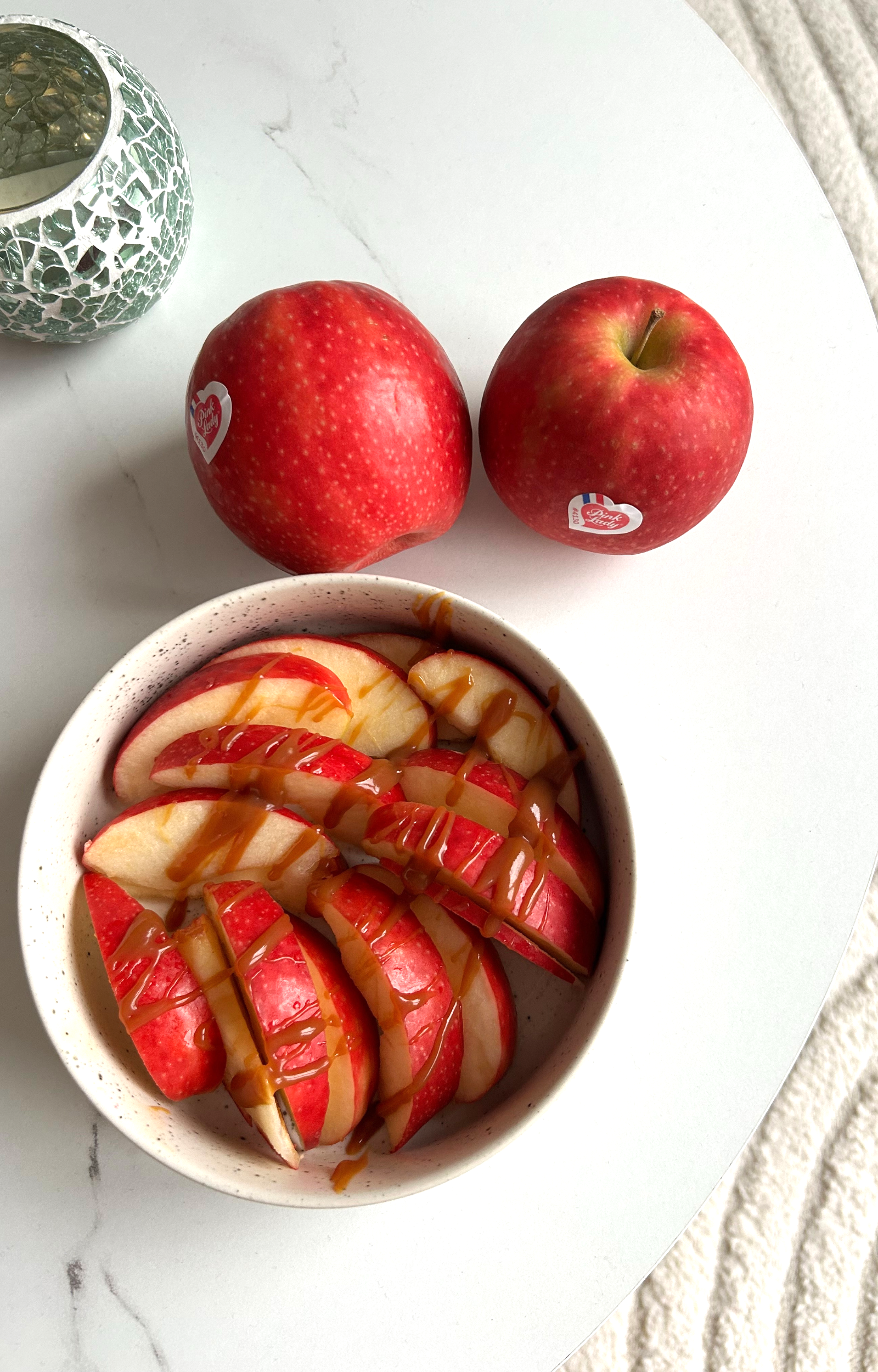 - Déposez les quartiers de pommes dans une récipient, puis versez un coulis de caramel au-dessus.