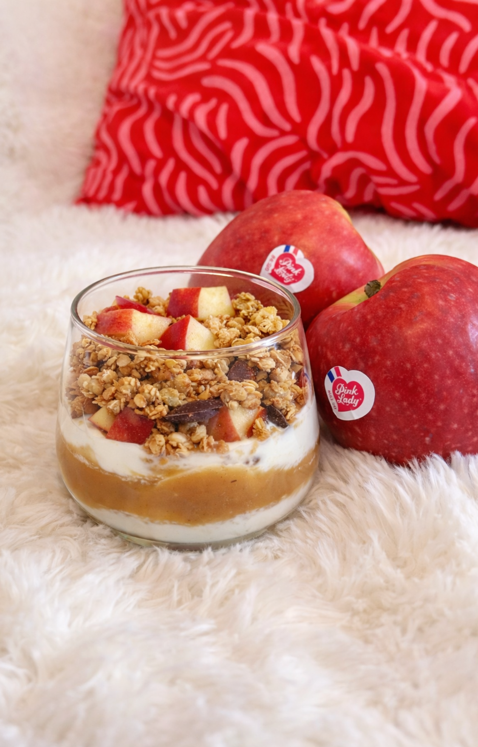 - Dans un récipient, superposez une couche de yaourt nature, un peu de compote (faite maison ou acheté en commerce), quelques morceaux de pommes et une dernière couche de yaourt.