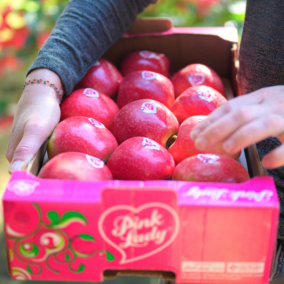 Chaque fruit est délicatement pris dans le creux de la main, puis basculé vers le haut pour se détacher sans s’abîmer. Ce geste minutieux contribue à faire de la pomme Pink Lady® une pomme unique. Tous les cueilleurs sont formés à ce geste emblématique, symbole du savoir-faire Pink Lady®. La pomme est ensuite déposée avec précaution dans des caisses.