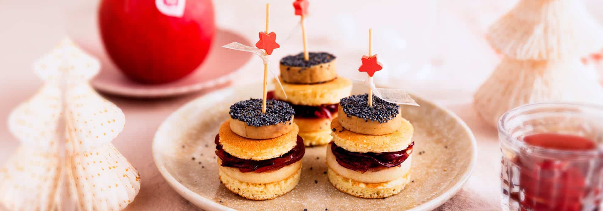 Le mariage des pommes Pink Lady®, du foie gras et du confit d’oignon fusionnent à merveille ! L’idée est de déposer chaque élément dans l’ordre pour obtenir le meilleur combo. Première étape, poser un mini-pancake en bas, puis une tranche de pomme, une couche de confit d’oignon, une seconde tranche de pancake et enfin un palet de foie gras. Ensuite, mettez un soupçon de sirop d’érable sur le foie gras et déguster bien frais !